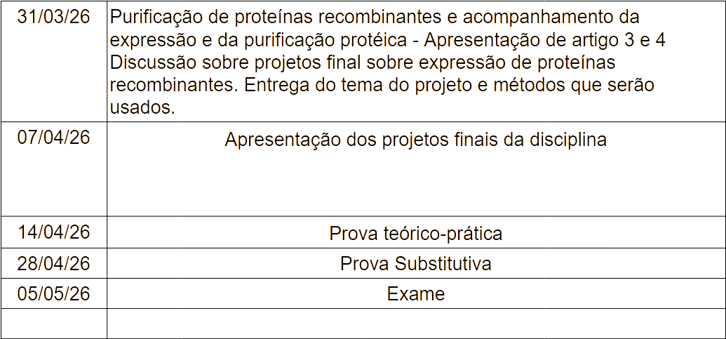*Reposição da atividade: resumo crítico sobre o artigo relacionado ao tema do FDG. Esta atividade de reposição é individual, e contará como metade do valor da nota do FDG.30% - Projeto de Pesquisa (PP): para realização dessa atividade cada grupo irá elaborar um projeto de pesquisa sobre expressão de proteínas recombinantes. Além da parte escrita, cada grupo deverá apresentar na forma de seminário o projeto final elaborado (15 a 20 minutos) Os critérios de avaliação serão: Criatividade do tema, Apresentação (Slides e Oral), Conteúdo, Domínio do assunto, Correção conceitual e Tempo de apresentação. A ausência do aluno na apresentação do projeto final acarretará numa perda automática de 50% no valor da nota inicial.