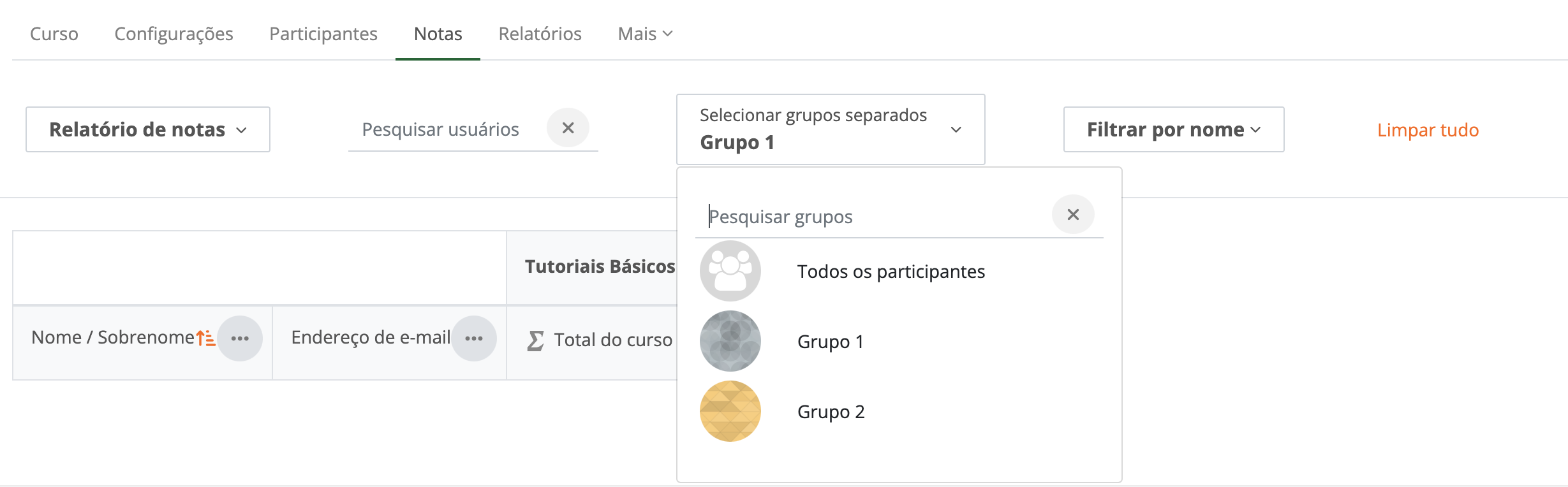 A partir da inserção, é importante salientar que, caso queira ordenar seus alunos de acordo com os grupos, para verificar a lista de participantes ou verificar o Relatórios de Notas e Conceitos, deve se selecionar o grupo desejado na área correspondente, pois, a ordem dos nomes que aparece, tanto na área de Participantes, quanto em Notas, por padrão aparecerá de acordo com o nome e sobrenome.