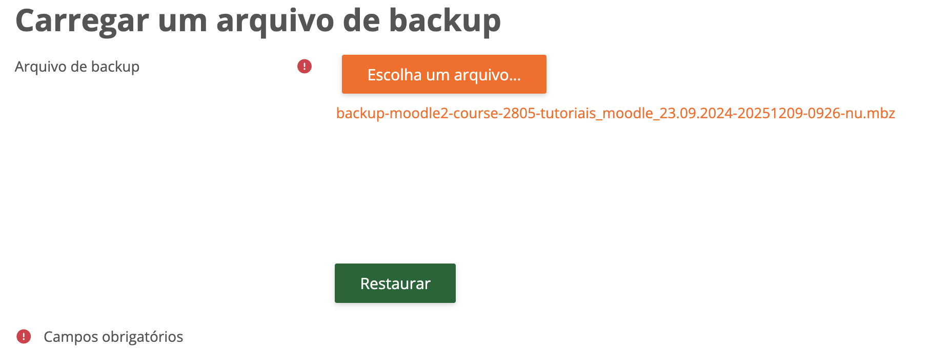 - Importante: antes de iniciar a restauração, é necessário criar um curso vazio. A restauração só pode ser realizada após o curso existir.