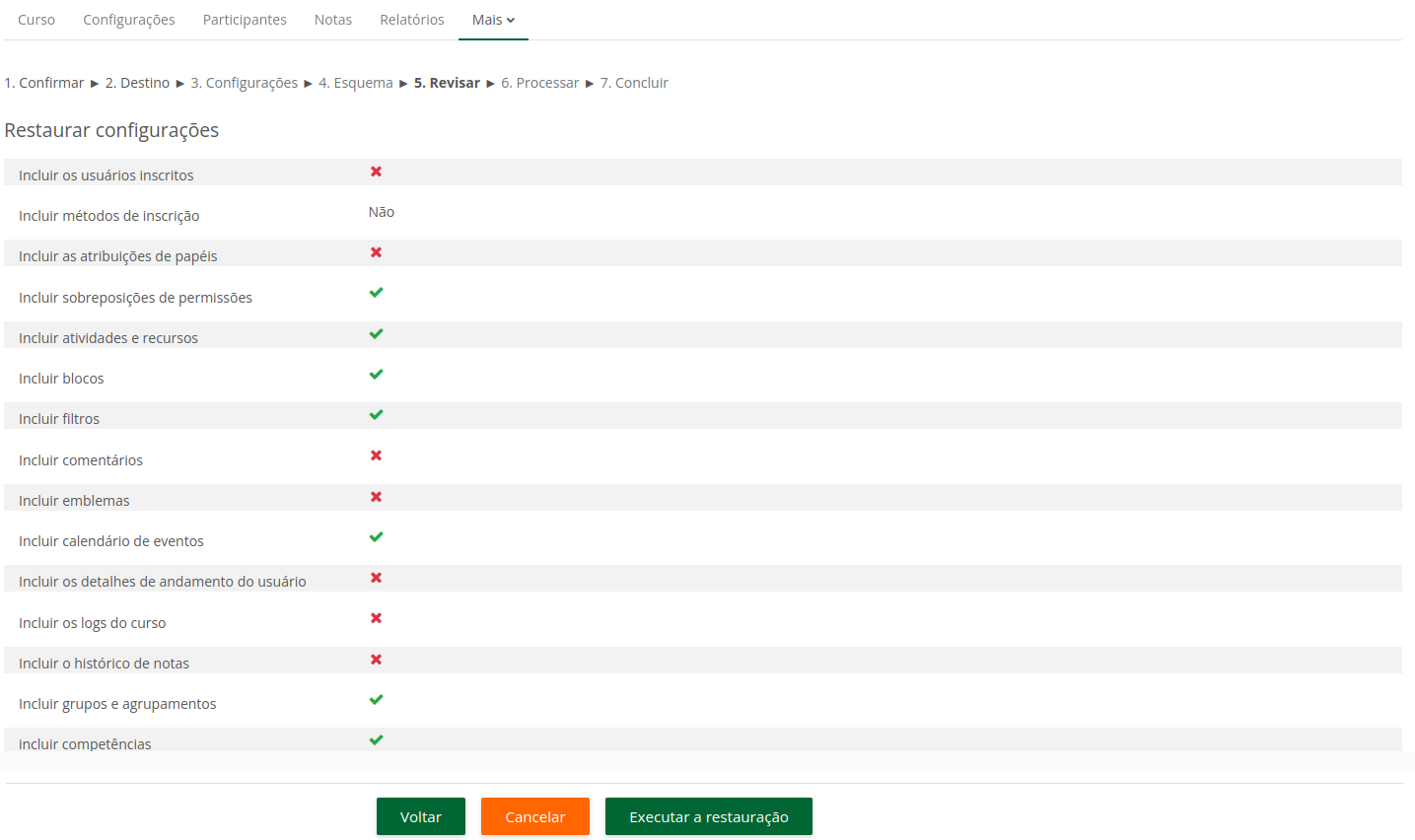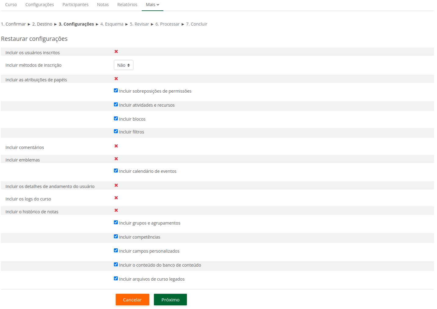 2. Restauração do curso na instância atual